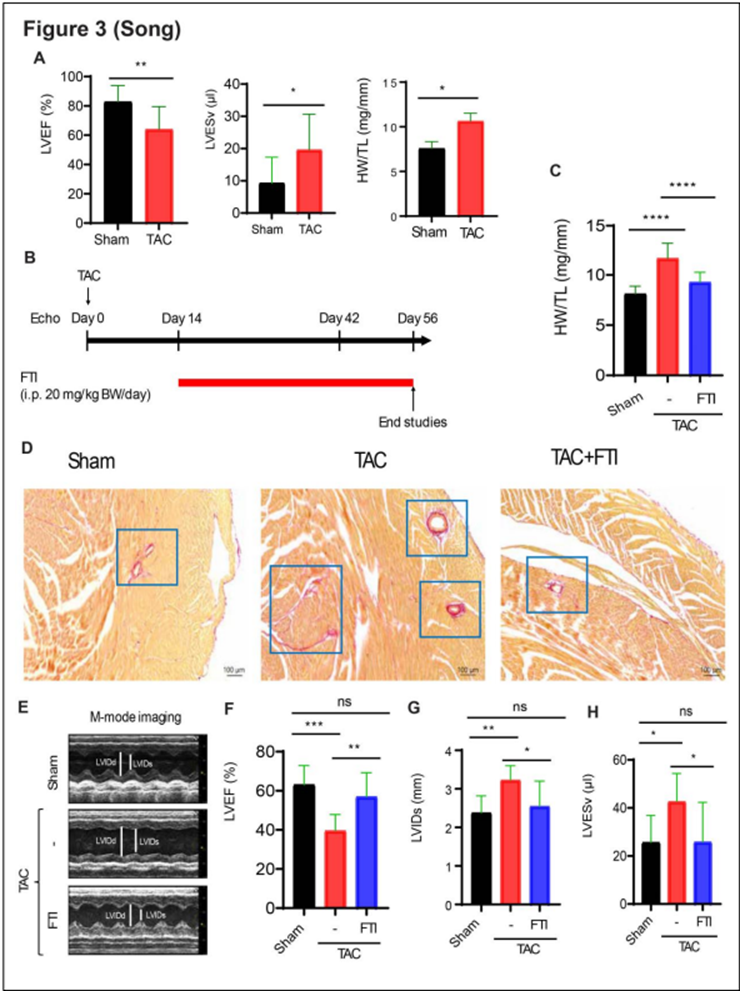 FTI227, a potent farnesyltransferase inhibitor, reverses cardiac remodeling and restores systolic function in a mouse model of HFrEF: A) Mice subjected to TAC showed a 23% decrease in left ventricular ejection function (LVEF), a 100% increase in left ventricular end-systolic volume (LVESv), and a 44% increase in the ratio of heart weight to tibia length (HW/TL). B) Experimental design. C) FTI treatment reversed cardiac hypertrophy, shown as ratio of heart weight to tibia length (HW/TL). D) Fibrosis assessment (PicroSirius Red staining) of heart sections. FTI treatment reversed cardiac remodeling in HFrEF mice. E-H) Echocardiography measurement of systolic function of left ventricle after 8 weeks of TAC.