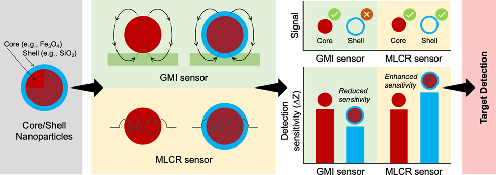 This figure shows the schematic comparing conventional GMI sensors and the magneto-LC resonance (MLCR) sensor. The MLCR design detects both magnetic and dielectric signals from core/shell nanoparticles, achieving enhanced sensitivity for biosensing and diagnostic applications.