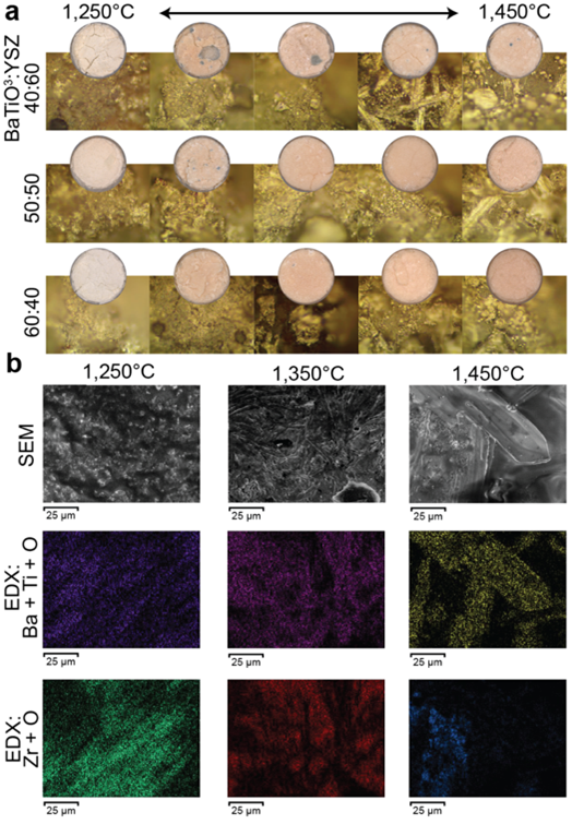 Figure 1. Evolution of BTO-YSZ hybrid bioceramic: (a) surface morphology, (b) segregation of BTO and YSZ