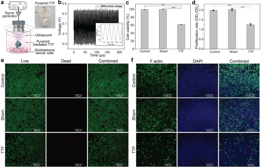 The image shows the implantable ultrasonic-powered TTF prototype and corresponding in vitro results demonstrating reduced glioblastoma cell viability after treatment.